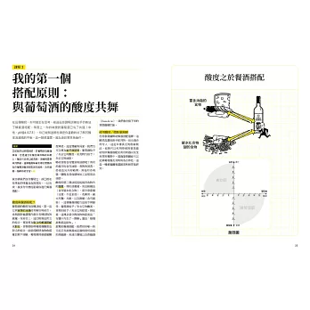 ▌「酒食搭配其實是件很主觀的事,多方實驗與嘗試是不二法則。本書便是在這樣的前提之下,先用簡單易懂的座標圖表方式,提供讀者一個十分邏輯的概念。接著鼓勵大家自行做嘗試練習,最後才提出作者的搭配建議。書中也有加碼提到其他酒精飲料的搭配原則。是本非常適合想要對法國料理的酒食搭配進一步鑽研的朋友。」