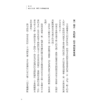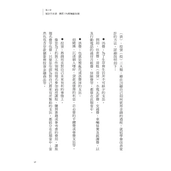 我相當認同作者提到一個重要觀念:「非常不建議在自身財務狀況還沒有改善之前,就貿然投資。因為當你還不了解投資標的,且在資金不夠充裕時,就勉強自己開始投資,便會因為急著想要快速獲利,而小看投資,甚至因為失去財務的彈性,而遭遇到不可測的風險!」這與我常說的「無恆產者,必無恆心」,是相同的道理。
