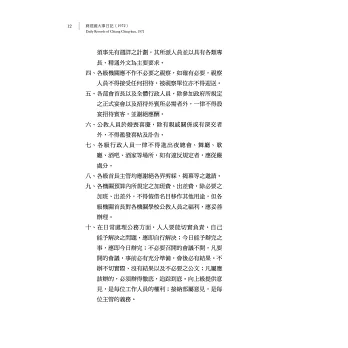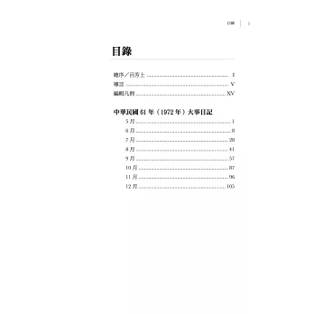 本書收錄1972年5月至12月的大事日記,內容包括蔣經國接見賓客的紀錄,上山下海巡訪各地的見聞,重要會議的指示,各式各樣的文告與演講,可以看出蔣經國一方面要努力建設,發展經濟,一方面還要面對中日斷交,穩定民心。苦心孤詣,躍然紙上。
