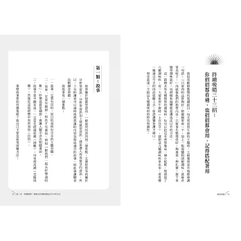 第一個角度從上台流程切入,包括「開場吸睛十招」,快速讓聽者放下手邊事,把注意力集中到台上;以及「持續吸睛三十三招」,讓你在超過二十分鐘的分享中依然能抓住聽者注意力;並且透過「結尾吸睛九招」,讓聽者對你的內容印象更深刻。從讓聽者想聽、專心聽到最後記得住,我在上台流程的前、中、後段都提供了方法。