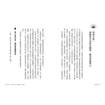 現在,教學與演講準備得豐富的師長們不會再像我以往一樣無助了,培祐把他聚焦在吸引觀眾注意的壓箱寶全寫出來,從開場、中段到結尾,如何讓觀眾無痛放下手機,把目光與心力專注地聽你說,總共五十二招上台的方法,持續你教學的熱情與動能,學生也因為你的課堂而豐收。