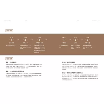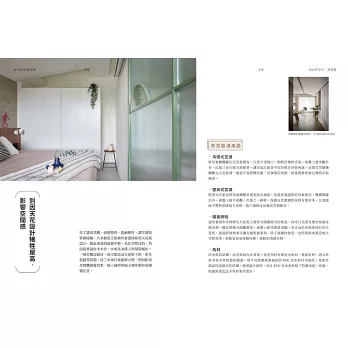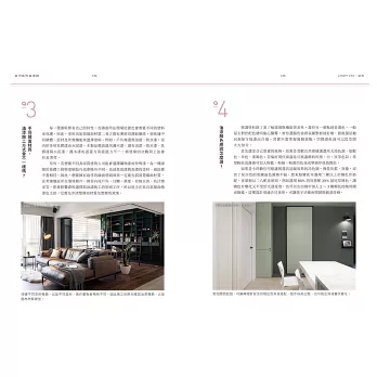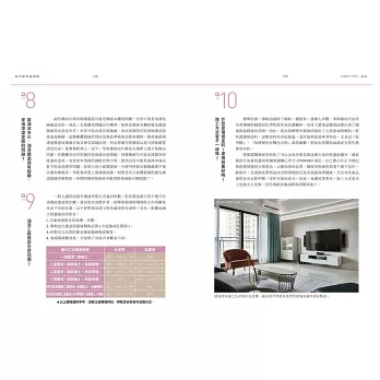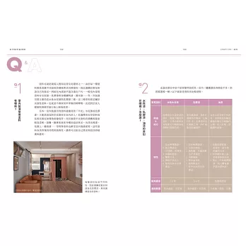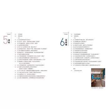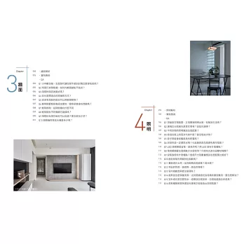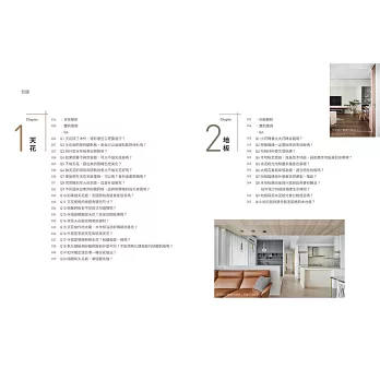根據天花、地板、牆面、照明、塗料、系統櫃,幾個常見居家裝修重點區域做為章節分類,章節中從設計、選材及施工面向做解析,讓讀者對於裝潢工程有基本認知,藉此便可確實掌握工程內容及進度,其中並提供施作完成實際案例,以便更具體了解完工樣貌,並在每個章節最後集結各種裝修問題,為讀者解決居家裝修時的迷思與困惑。