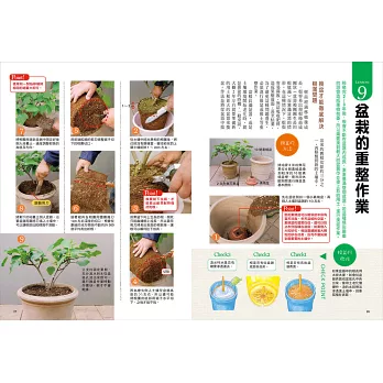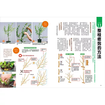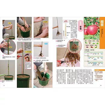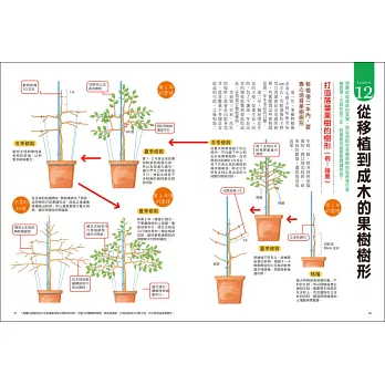書中詳細解說盆栽果樹需求的環境、不同種類果樹的樹形(透過整枝和修剪方法調整)、選擇樹苗或盆器、調配培養土、定植和施肥、換盆、澆水,以及如何依各種果樹的結果習性逐年照顧果樹(修枝或根、立支架等)的方法。此外,也依各果樹種類所需特有的管理技術,諸如授粉、疏花、疏果、病蟲害防治、避免寒害的操作等詳加說明。