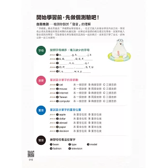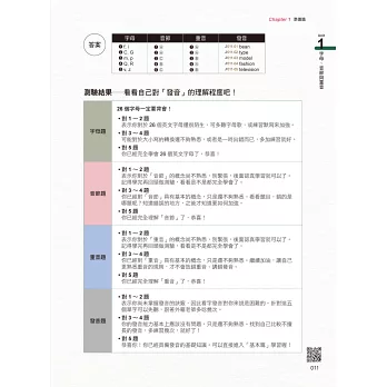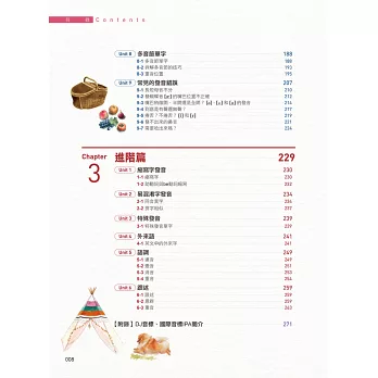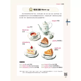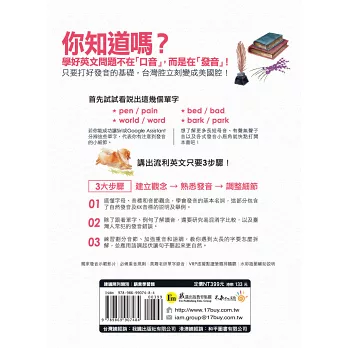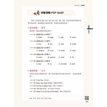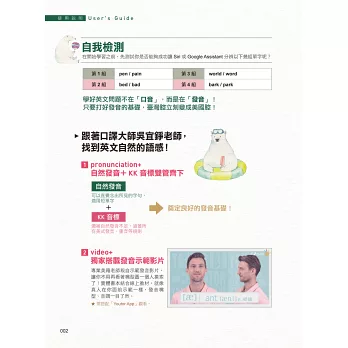 為什麼apple, art, again中的a發音都不一樣呢?full(充滿的)要怎麼念才不會像fool(傻瓜)?你要的答案,這一篇都有!除了按部就班跟著豐富單字、例句練習音標讀音,記憶字母組合常見的發音等。還可以深入探究本篇收錄的有聲子音、無聲子音易混淆字比較,以及台灣人常犯的發音錯誤,矯正自己容易讓人產生誤會的字詞發音。