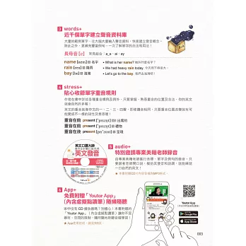 在英文中,重音對發音具有極大影響,如同中文的一、二、三、四聲,即使讀音相同,只要重音位置改變就有可能變成不一樣的詞性及意思。本書於音節的單元中詳述各種長度單字的重音慣例及其例外,只要掌握、熟悉重音的位置及念法,你的英文就會自然許多喔!