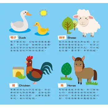 針對書中6隻動物:乳牛、豬、綿羊、馬、雞和鴨子,介紹其英文名稱及特色,強化孩子對該種動物的基礎認識。