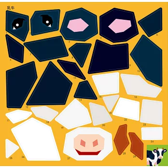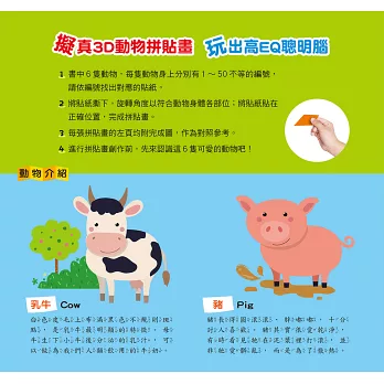 書中共6隻農場動物,每種動物分別有1~50不等的編號。依編號找出對應的貼紙,旋轉角度以符合動物各部位,將其貼在正確位置,即完成拼貼畫。