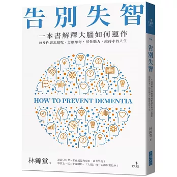 本書從「心智認知系統」的認知科學角度切入,帶領讀者認識大腦的構造、記憶力的特性及運作機制等等,循序漸進,了解引發失智、癡呆症的任何可能原因。作者林錦堂常年在社區大學及大學教育推廣中心等第一線,教學腦力活化課程及藝術治療,他希望透過本書傳達「失智是可以預防」的重要觀念,以及適合中老年人的腦力活化法。只要能及早察覺可能跡象,並透過多項生活技法和運動等方式,就能減緩、改善甚至防止失智發生,進而能達到擁有長期良好生活品質的目標。