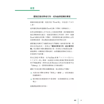 儘管書店內陳列了為數眾多的入門書籍(這些都是好書,我過去也受益良多),但是以「擺脫初學者行列,組合實用巨集」為主題的VBA書籍卻很少見。於是有人向我提出企劃,請我撰寫一本給擺脫初學者行列的實用VBA教材,而有了這本書。