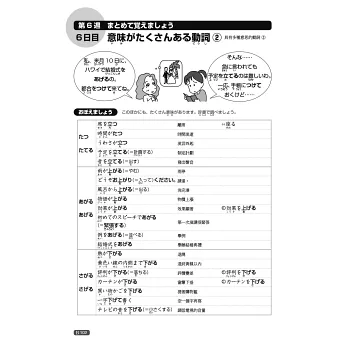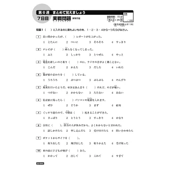 每週第1~6天,各有兩頁學習內容,並附2~3組練習題,確認相似或易混淆詞彙,是否已確實掌握。第7天「實戰問題」則以日檢形式出題,〈漢字〉每回20題,6週共120題;〈語彙〉每回25題,6週共150題。