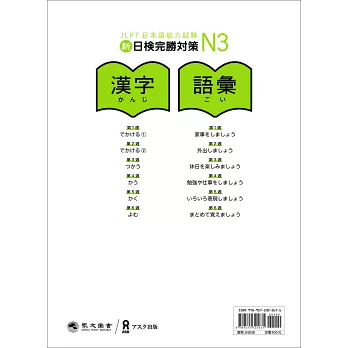 本書《新日検完勝対策N3:漢字‧語彙》為日本アスク出版社所出版的《日本語総まとめ N3漢字》及《日本語総まとめ N3語彙》的合訂本。考量讀者在學習日文或準備日檢時,漢字、語彙都是必讀基礎項目,因此將兩本合併,方便學習。