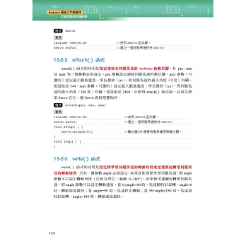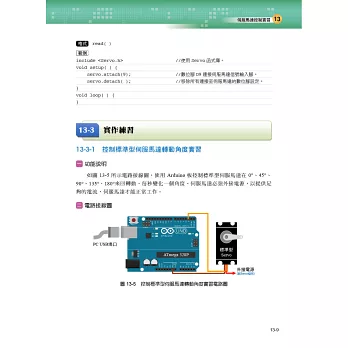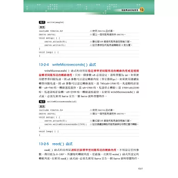 ˙內容多樣化:使用常用元件及模組,包含發光二極體、矩陣型LED模組、七段顯示器模組、液晶顯示器模組、蜂鳴器、指撥開關、按鍵開關、矩陣鍵盤、直流馬達、伺服馬達、步進馬達、RFID模組、紅外線模組、藍牙模組、RF 無線模組等,以及各類型感測器如光敏電阻、超音波感測器、溫度感測器、溼度感測器、三軸加速度計、三軸數位陀螺儀感測器等,精心設計超過260個豐富多樣化的實用範例。