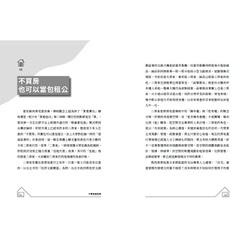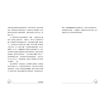 在買房困難的年代,Tody不買房也能當包租公、包租婆的技術和心法,是開啟大家人生出現另一個可能性的方式,用較低的成本獲得較高的獲利,或被動收入。而本書正是讓無法親自上Tody課程的朋友們,可以透過她清晰有條理的文字,更容易了解這個產業的管道。