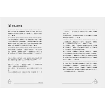 回到這本書《不買房當房東》,看到每一章節的內容與標題,就讓我想到那個曾經一起規劃課程的Tody,她還是一樣的邏輯清楚而且思緒縝密。Tody會在你提出問題前,就回答你心中疑惑,像「如何和屋主溝通?」、「二房東合法嗎?」這些簡單的技術性問題,完全不需要你開口提問。而更深層面的心理問題,像租屋者的角度和心態、設計與需求,或共生趨勢與現象等等,她也都幫你想好了。就像我們當時在巴黎的workshop,Tody什麼都幫大家準備好了。