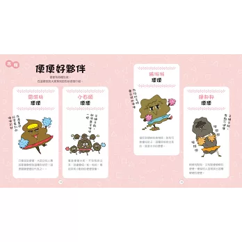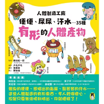 在診療時,常常面對小朋友問許多跟生理相關的問題,例如為什麼會有鼻屎?為什麼會放屁之類的?這套書把人體的有形、無形產物設計成各種有趣的角色,例如腳臭犬、香氣人魚、耳屎金剛和鼻屎挖娃等。還有許多比較,例如不同種類的大便。大便這件事,對孩子很重要,因為門診時發現很多小孩不太會觀察,覺得很害羞或是不曾注意,但是大便的形狀和身體狀況息息相關,所以如果能用這套書來跟孩子解釋就太好了,書的內容很能滿足孩子的好奇心跟求知欲,非常適合大小朋友邊看邊笑的一起認識人體各種生理現象是怎麼來的!——黃子玶(大安悅兒親子中醫診所總院長)