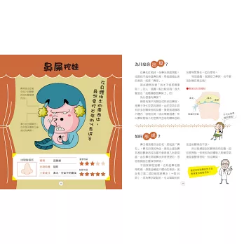 其實,除了鼻屎、便便這種有形狀、能被看見的東西之外,人體還會產生很多無形的,例如放屁、口臭、緊張時的心跳等東西,而且這些有形無形的產物竟然多到可以出兩本書!作者將每種身體產物塑造成有趣的角色,讓我們一看就懂,還能牢牢記住(不過,為了要生動翻譯,巫婆也產出許多汗與淚T_T)。