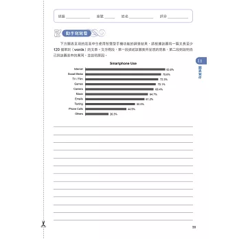 包含:圖表寫作、看連環圖寫作、信函寫作、引導式寫作、主題式寫作……等類型,共收錄 36 篇題材。