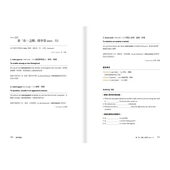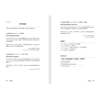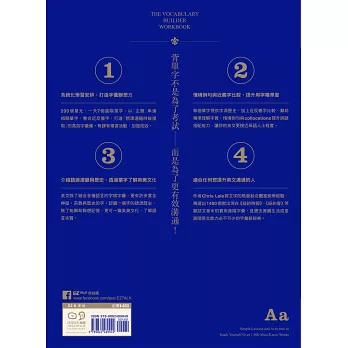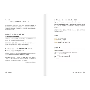 不同於傳統單字書的「詞性→發音→定義→例句」,本書以「主題」整合串連相關單字,整合用法相近或相反字詞,打造「想溝通隨時能提取」的高效字彙庫。每課都以不同的複習活動作結,加強成效。