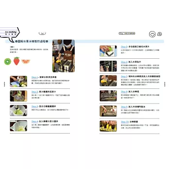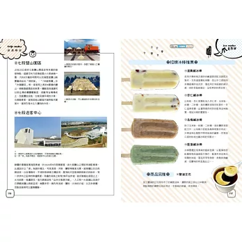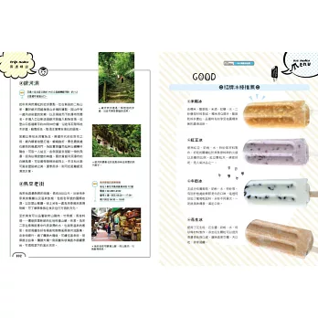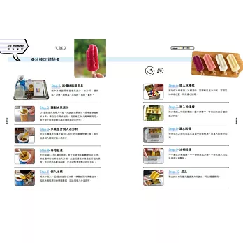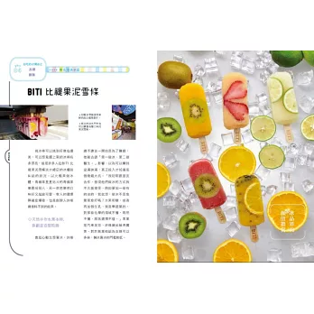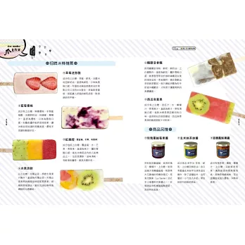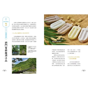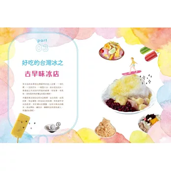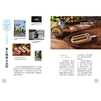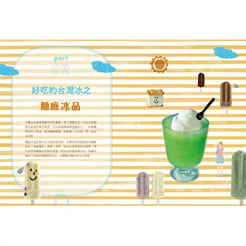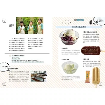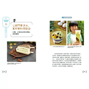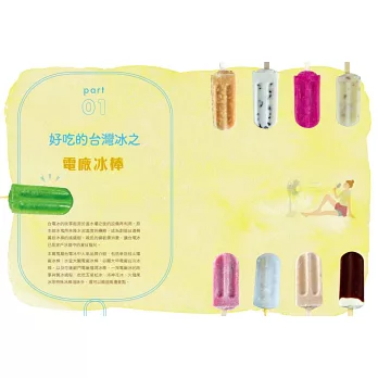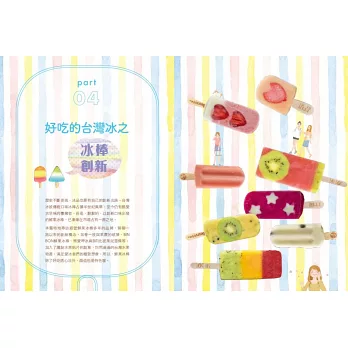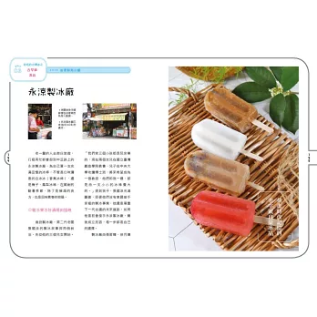 ◎特選大甲溪發電廠五葉松冰棒、善化糖廠的冰淇淋、814麗香冰店─創始老店冰棒、美方芋仔冰城的芋仔冰、Bin Bon手工鮮果冰棒的水果冰棒,招牌冰品製作過程詳實全圖解。還有熊愛呷冰、春一枝商行的冰棒DIY體驗。