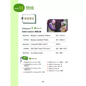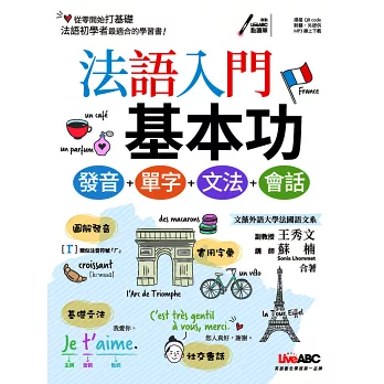 本書專門為台灣學習者所撰寫的初級法語教材,共分成四個單元:法語發音、必備單字、基礎文法和情境會話。每單元使用簡短實用單字,由淺入深漸進提供法語好學好記的學習途徑。單元最後隨堂練習讓初學者可以自我檢測法語的聽、說、讀、寫基礎能力,適合在家自學者、欲準備法語檢定考試 A1 者以及想輕鬆學習如何和法語母語人士進行基礎對話的入門者。