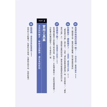 我身為中華民國談判管理學會會員,閱讀過許多談判的國內外書籍。作者透過俯拾的小故事,將生硬的談判技巧予以揉合,讀來特別適合台灣人情,並適用在你我職場。展頁本書就將十幾年大師的江湖功力,盡數吸取。過癮!過癮!──張敏敏(JW智緯管理顧問公司總經理)