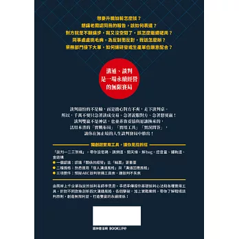 國內外談判的書籍我看了很多,大多數充滿深奧的理論,以及難以運用的描述。我一口氣將這本書讀完,本書容易懂又實用好上手,誠摯推薦。──李河泉(「跨世代溝通」千萬首席講師、商周CEO學院課程教練、東吳大學人社學院副教授)