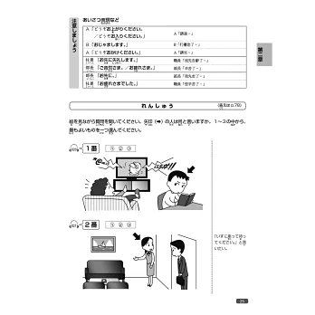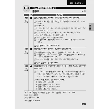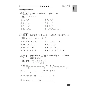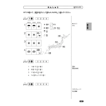 各章皆有一回「まとめ問題」確認讀者的理解程度。第5章的總練習題(総まとめ問題)是以日檢形式出題的模擬測驗。大量的練習題,讓學習者可自我檢核學習成效,同時熟悉日檢題型,增強信心,確實提升聽解能力。