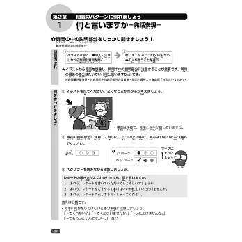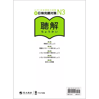 針對日檢N3聽解5大題型舉例說明。在解答練習題的同時熟悉出題形式。5大題型包含:「發話表現」、「即時應答」、「課題理解」、「重點理解」、「概要理解」,除了說明不同的出題流程,也指出問題核心,幫助讀者徹底掌握解題關鍵。