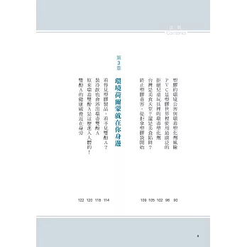 環境荷爾蒙對內分泌的干擾機制怎麼運作的?不同毒性分類有甚麼差別?那些日常用品可能有環境荷爾蒙、塑化劑?本書有近半數的篇幅圖像化,透過生活化的插畫與圖片,將專業的化學知識去繁簡化,避免冗長的說明,讓讀者迅速確立觀念,而非與日常無關的艱澀知識。