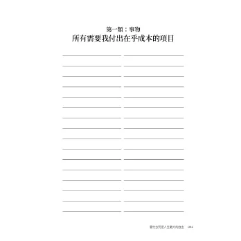人能在乎的事情有限,在乎得越多,就會犧牲掉越多時間跟自由。藉由這份預算表,你可以清楚看出事情的輕重緩急,少在乎一些沒必要的責任感,多在乎一些你認為真正重要的事。