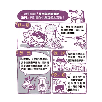 2. 故事搭配40則漫畫謎語,謎題參照低年級課綱,跨領域出題:每篇故事結合小學低中年級學校課程主題,設計有趣的謎語,包括:生活領域、國語文領域、數學領域等。以漫畫形式把原理知識交給隱藏角色咕狗來說明,提升認知好奇心,也引導深入辦析與強代邏輯思考。