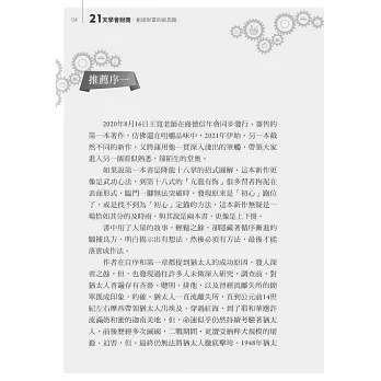王寬(寶哥)老師「21天學會財商,創造財富的新思路」新書出版之際,邀我撰寫文推薦,實在不敢當,僅提供以下的一些拙見,希望能幫助讀者了解王寬(寶哥)老師的人生理念、價值觀,以及對成功的獨到見解,王寬老師講授成功管理哲學,非常生動感人,彷彿在他的心目之中對成功管理心法有無限美麗的風景似的,令人流連忘返,王寬老師授課極為認真,同學們任何疑惑,他都親切熱忱,很有耐心的解答,不厭其煩的分析,他以最淺白、最簡單的譬喻,孜孜不倦地啟發、教導,他以四兩撥千斤的氣勢,把最深奧的成功管理哲學說得如此平易近人,多麼教人心悅誠服,使學者對成功管理心法豁然開朗,每次恭聆王寬老師授課,總覺得有如接受一次洗滌般那麼感到愉悅。