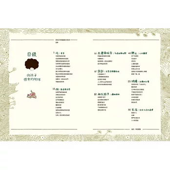 書中八個章節包含:吃(食育)、做(創造與消費)、在邊緣玩耍(自然探索與觀察)、設計(生態系與關係性)、相互給予(禮物精神與表達感謝)、練習安靜(心的觀察)、可持續性(地球與社會如何永續)、生活方式(生存與生活的選擇)。