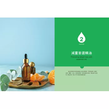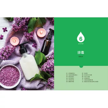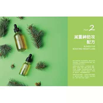 收錄各種天然配方,制勝瘦身大敵,針對五大類,包括食慾&代謝、提振精神、排毒、消化、睡眠&鎮定。像是刺激代謝擴香配方、克制衝動滾珠瓶、重新振作擴香配方、抗橘皮組織按摩油、燃燒脂肪按摩油、消脹氣按摩油、緩解便秘按摩油、揮別妊娠紋乳霜、深層睡眠擴香配方、紓解焦慮噴霧、揮別壓力滾珠瓶等。