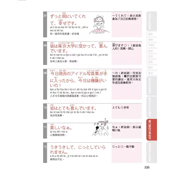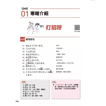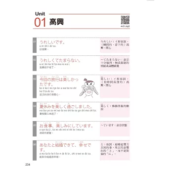 ★ 書末附上日本人會話常用的語尾助詞和感嘆詞等介紹,教你如何更貼近日本人的講話方式。