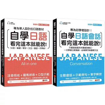 任何時間學日語都不晚,只要找到好教材,學好日語很輕鬆。本套書可以先用《自學日語看完這本就能說》從50音到基本文法、會話都能學會,接著用《自學日語會話看完這本就能說》來加強自己的會話能力。讓你從提升會話能力反饋基礎學習,這樣學習既實用又不無聊,真正達到學中做、做中學的完美結合。
