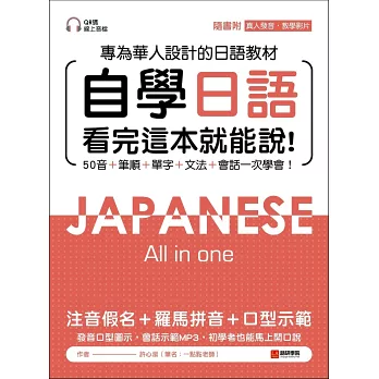 《自學日語 看完這本就能說》一本書就涵蓋日常基礎所需的50音、會話、句型、文法、單字,除了用假名標註發音、外加羅馬拼音外,同時加上漢字標音,好記又好唸!並由日籍老師影片示範所有日語字母發音方式,除了當然會有的50音之外,更包括濁音、半濁音、拗音等等所有的發音示範!除了可以看書學習,還可模擬影片中老師的嘴型,同時比對自己發音時的嘴型看看有哪裡不同,只要這本書,所有基礎日語所需要的知識統統都包辦。