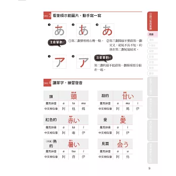 ★ 除了一般常見的清音之外,也包括濁音、半濁音、拗音、長音、促音、撥音等多種日語字母介紹。