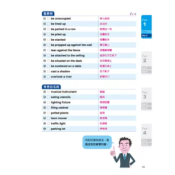MP3除聽力測驗外,也收錄閱讀測驗的全文朗讀,並以美、加、英、澳四國口音錄製而成,有效加強考生聽力,同時熟悉閱讀測驗的常見題型和字彙。另有APP可聆聽音檔,自行調整語速,培養聽力敏銳度。