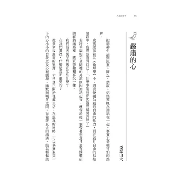你可以每天挑選其中一個關鍵字,當作當天的智慧提醒或靜心冥想的主題,也可以在逐一咀嚼之後,與好友互相討論、砥礪人生。面對人生,你所需要的力量和提醒,全都蘊藏在這本輕鬆易讀的智慧之書裡。無論任何時候,本書都將成為你在面對生命情境、探詢人生意義,或追尋個人夢想時,最有力也最實用的智慧工具箱。
