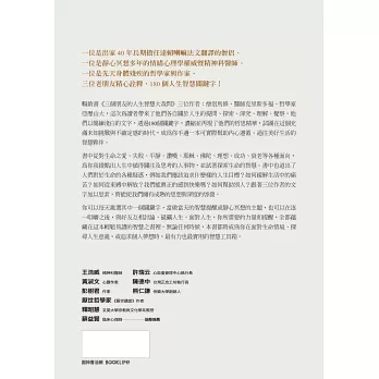 暢銷書《三個朋友的人生智慧大哉問》三位作者:僧侶馬修、醫師克里斯多福、哲學家亞歷山大,這次為讀者帶來了他們各自關於人生的提問、探索、深究、理解、覺察。他們以簡練淺白的文字,透過180個關鍵字,濃縮並再現了他們的哲思精華,試圖在這個充滿未知挑戰與不確定感的此時此刻,成為你手邊一本可實際幫助內心遵循、通往美好生活的智慧夥伴。