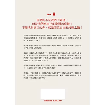 本書是一本實用的指南,幫助我們認清自己的心牢,並找到走出心牢、獲得自由的工具。當我們選擇走出心牢時,我們不只掙脫了束縛,更擁有了行使個人意志的自由,可以拯救自己的人生。