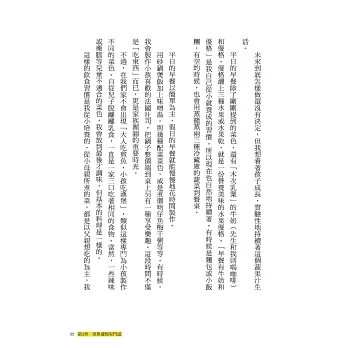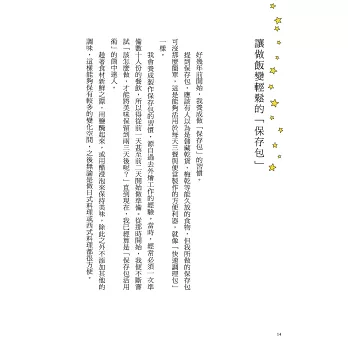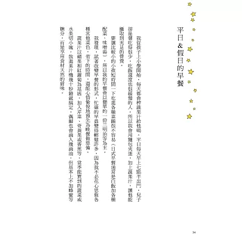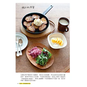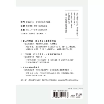 「不直接介紹食譜,而是告訴你發想食譜的方式。比如自己設好規則,一,主菜是用肉和魚輪流;二,每天都要吃菇類和海藻。還列出了一天的時間安排,可以知道作者是怎麼分配一整天家務的時間。」