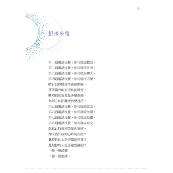 這本詩集教會我女人不僅止於似水柔情,還蘊含著更深層的意義,沒有讀過詩裡話語,就別說你是情場高手、洞悉愛情。很多時候,女人要的不是華麗珠寶、山盟海誓,所貪圖的只是那種淡淡的幸福,只要坐在旁邊一個擁抱、一個眼神或一句話,你就可以成為她的唯一。仔細品味這一本詩集,相信你也能成為女人引頸期盼的夜空流星。