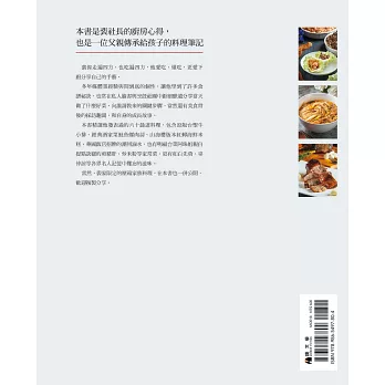 祖籍山東的裴家很特別,廚房由男人掌理主饋,裴偉承教父親,轉益多師,鎔鑄新創,再手把手教給兒子,此書是「爸爸的味道」,跨越三代父子兄弟,這是很少見的書寫,我覺得特別有意思。