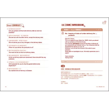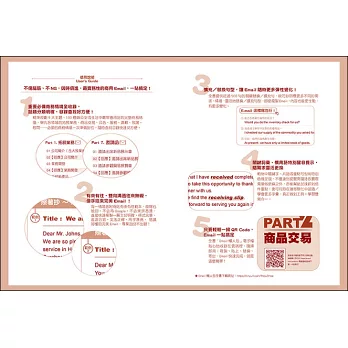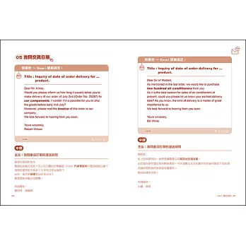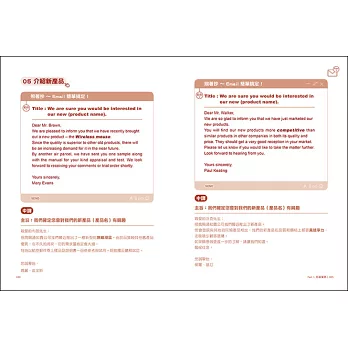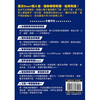 全書每一章節嚴選出現代忙碌的工商業社會裡,常見且重要之商業往來互動情境,只要從標題/主旨裡,就能輕易的找出所需要的信件範例,不僅可以一來一往的雙向互動,同時不論在主動寄信或是被動地回信,都提供兩篇不同範本供您選擇,現學現用,能寫能回,快速提高工作效率與專業能力,讓撰寫電子書信不再傷腦筋,不再是苦差事。另外,每篇文章特別挑出關鍵詞彙、慣用語,還有全書超過500以上的替換句和擴充句,讓你在面臨不同情境時,能充分多元化的運用,舉一反三,書信更豐富有變化,還能在潛移默化中提升英文力及兼顧實用性。