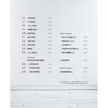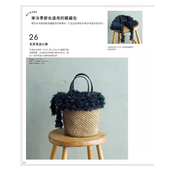 本書集結日本九位人氣手作家的設計,收錄28款作品,包含充滿度假風情的寬簷帽、俐落的康康帽、質樸的麻編包、色彩俏麗的手提包、口金包、零錢包,以及2用、3用包等。這些適合春夏季節的帽子與編織包,只要結合冬季的溫暖材質或裝飾,立即成為四季皆宜的服飾單品!
