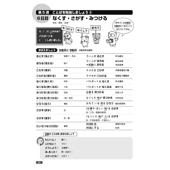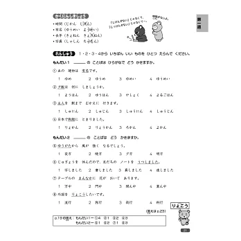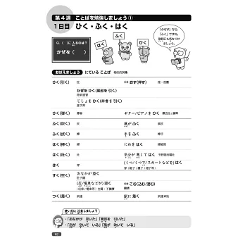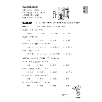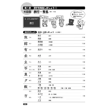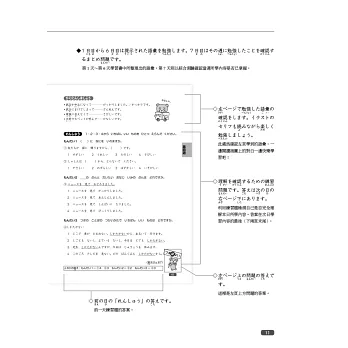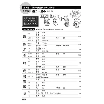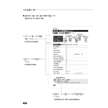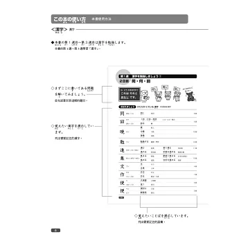 本書左頁以插圖形式提出問題,在進入課程前先自我測試,右頁同樣再以有趣的插圖,幫助學習者確認漢字和語彙的用法、意義或字形。