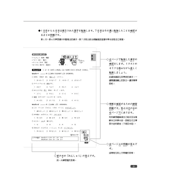 每週第1~6天,各有兩頁學習內容,並附2~3組練習題,確認相似或易混淆詞彙,是否已確實掌握。第7天為「綜合測驗」,每回20題,6週共120題。