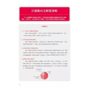 除了最新出題趨勢、題型及主題模式之外,全書以系統性漸進式學習法做為主軸,絕不讓你只是毫無頭緒、不明究理地背題庫、背單字、背口訣。在「奠定基礎」單元的練習中,分析說明各類題型出題方式、關鍵字,以及容易混淆的表達方法;在「成為實戰高手的祕訣」單元中,透過分析彙整應對各類題型與主題情境的解題策略,以及各種企圖混淆考生的陷阱選項,讓你知道解題該從哪裡下手、聽音檔要聽什麼關鍵字、看題目應該要注意什麼重點,解題有效率、更有效果!